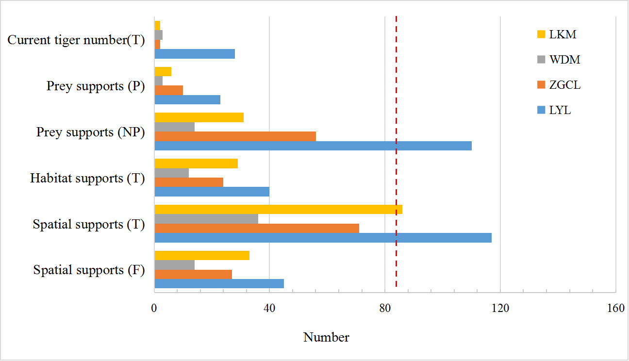 尽管如此,我国当前4个景观斑块内的东北虎分布区面积能够支持的成年雌虎数量仅分别为45只(老爷岭), 27只(张广才岭), 14只(完达山)和33只(小兴安岭)。国际虎豹专家查普隆(Chapron)等在2008的研究已表明,需要至少83只繁殖雌性个体才能够维持一个虎种群的可持续生存。因此,研究认为包括东北虎豹国家公园所处的老爷岭在内的所有景观斑块均不能独自支持一个可持续生存的野生东北虎种群。